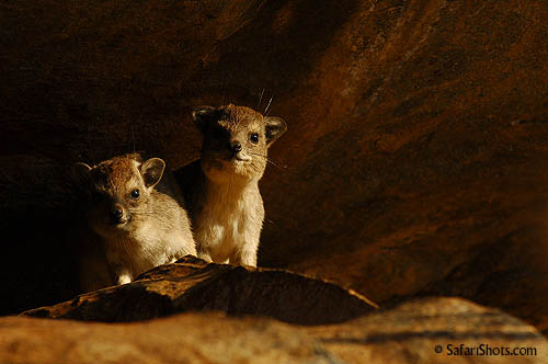 A great example of a seemingly unlikely animal to find fascinating is the Rock Hyrax, aka Dassie, aka Pimbie. These small mammals are the closest living relative to the elephant! They live on rocks and in trees which become stained with brown streaks of hyrax urine. They have an interesting social structure and a naturally paranoid demeanor (you would too if you were a favorite food of various eagles and leopards). At the slightest hint of danger, one hyrax will send a shrill warning call and all in earshot will vanish into cracks in the rocks. Soon a few braver individuals will venture forth to keep an eye on the percieved danger. They are adept climbers and will climb to the farthest reaches of thin branches to collect seeds and to eat the tender tips of new growth. Hyraxes can become accustomed to people and will provide hours of entertainment around lodges and safari camps. Compare the photos of the hyraxes below to the typical view tourists get of a lion. Which do you find more interesting?